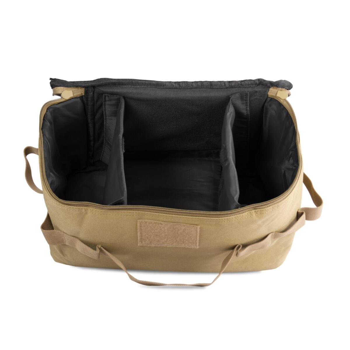 The bag works great as a “basket” for picnic items. You can throw in pots, a burner, a gas cylinder, plates, and cutlery. Attach cups to the molle straps. Everything is in one place, ready for the trunk and the road. From the trunk to the shelf. Clean, neat, and always everything in one place.