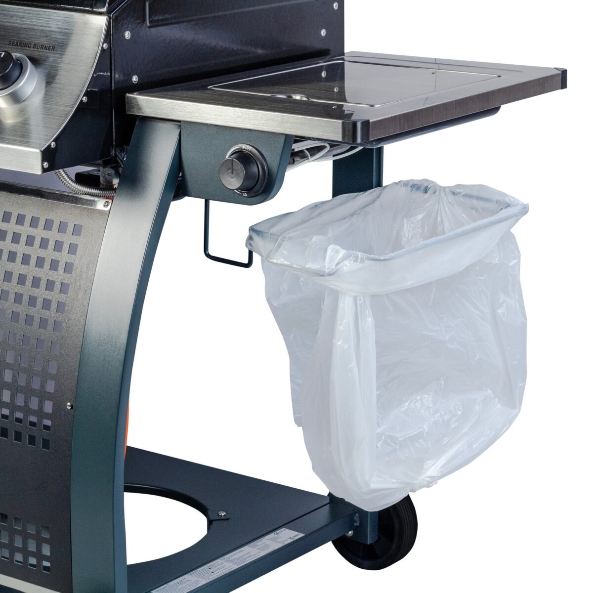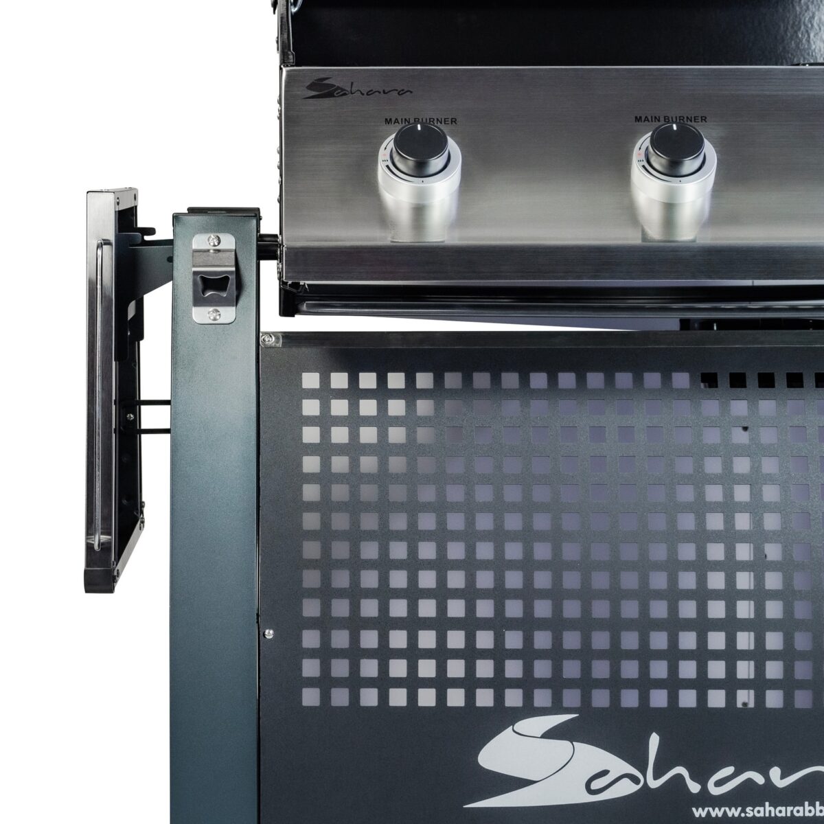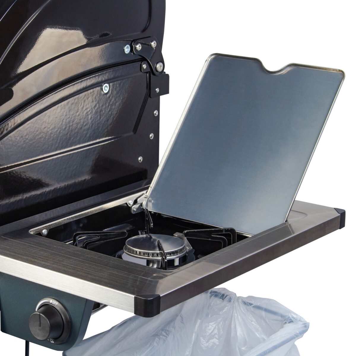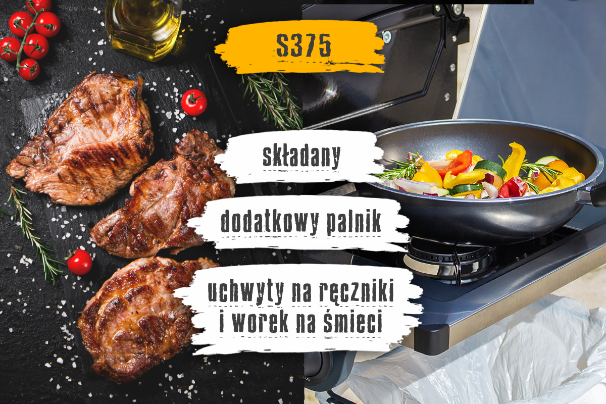 Kolejnym udogodnieniem S375, jest składany lewy boczny blat, oraz dodatkowy palnik wkomponowany w boczny blat. Dzięki dodatkowemu palnikowi możesz w trakcie grillowania zagotować wodę, usmażyć jajka czy przygotować warzywa z patelni. Złożenie lewego blatu pozwoli Ci zaoszczędzić miejsce.
