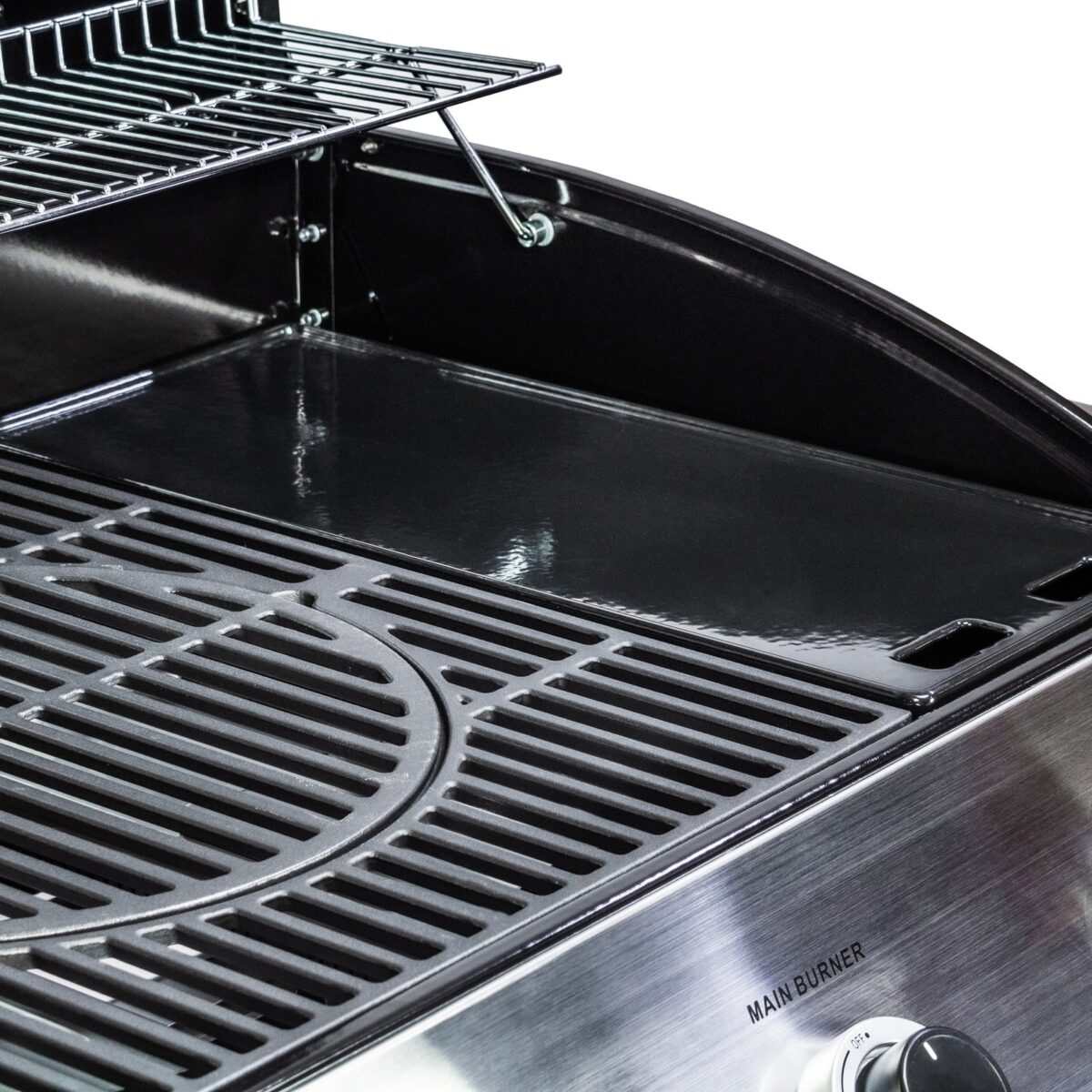 Ruszt został podzielony na 3 części aby ułatwić jego dopasowanie do Twoich potrzeb, a także utrzymanie go w czystości. Taki podział pozwala na bardziej komfortowe wyjmowanie rusztu z grilla, a także dopasowanie go do swoich potrzeb. Emaliowany aromatyzer z drugiej strony jest płaski. Możesz na nim gotować lub serwować potrawy, które dłużej utrzymają wysoką temperaturę.