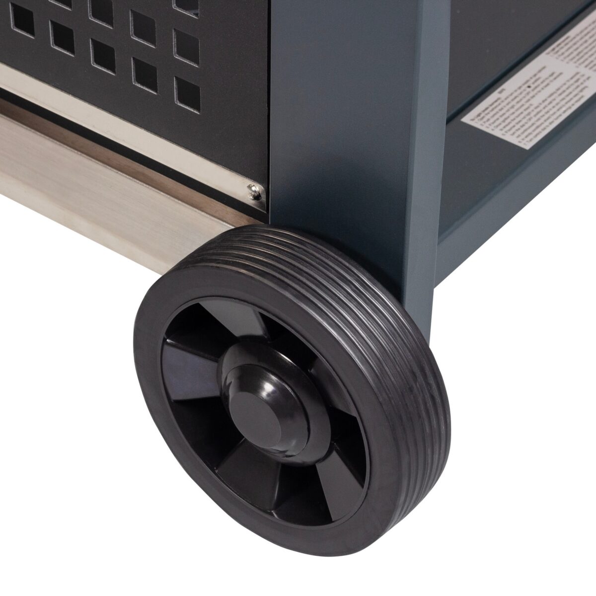 Grube pokryte gumą kółka ułatwiają przenoszenie grilla, a hamulce skutecznie unieruchomią go w docelowym miejscu. Grill posiada miejsce na dwie butle, chowaną za elegancką osłoną z logo firmy, układaną na półce. Dzięki temu możesz go przenosić bez potrzeby demontażu butli gazowej.