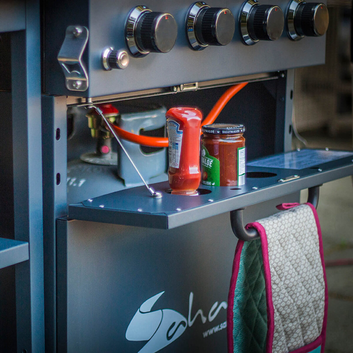 Kolejnym udogodnieniem X475, są otwierany boczny blat, oraz boczna dodatkowa powierzchnia do przygotowywania posiłków wraz z półkami– stolik szefa kuchni. Dzięki dodatkowemu palnikowi w bocznym blacie możesz w trakcie grillowania zagotować wodę, usmażyć jajka czy przygotować warzywa z patelni. Grill posiada uchwyt na napoje czy sosy oraz otwieracz do kapslowanych butelek. Na półce bocznej umieszczono haczyki do zawieszenia ściereczki lub przyborów do grillowania. Znajduje się tam także deska do krojenia z pojemnikiem. Dzięki temu utrzymasz porządek.